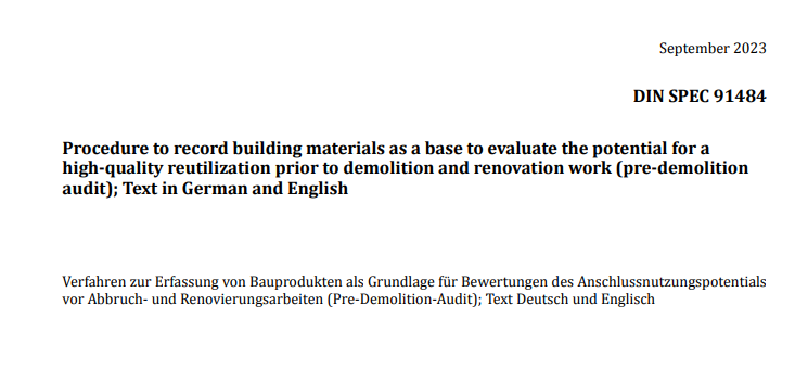 DIN – German Institute for Standardization. (2023) DIN SPEC 91484: Procedure to record building products as a basis to evaluate the potential for high-quality reutilization prior to demolition and renovation work (Pre-Demolition Audit). Berlin: DIN. Available at: https://www.dinmedia.de/en/technical-rule/din-spec-91484/371235753 (Accessed: 28 April 2025).