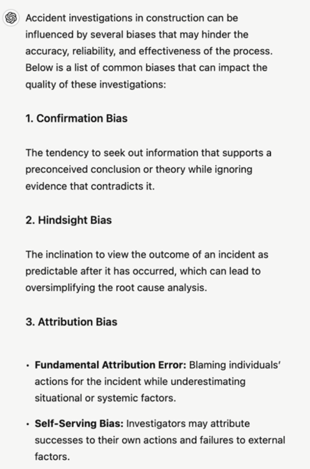 Result: The second prompt provides similar results to the first but includes information relevant to incident investigations. It also begins to discuss how these biases might affect the incident investigation process.