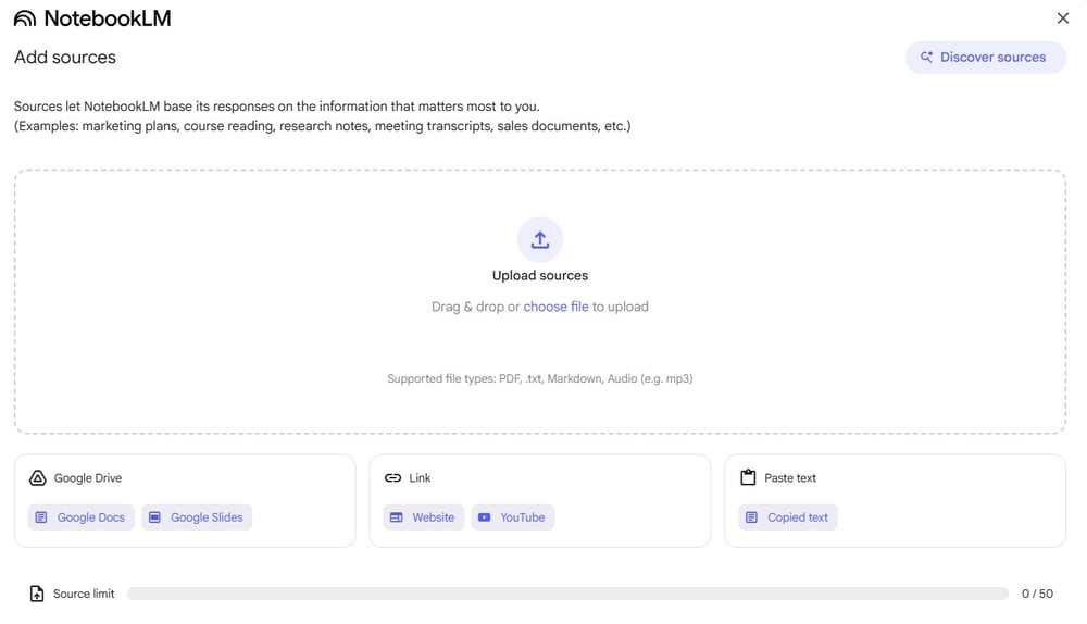 The first thing you will see when you create a new notebook is a window that allows you to upload sources.